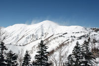 Mt. Hiuchi (2462m) The highest peak within Niigata Prefecture, located just to the north of Mt Myoko. We tour up to the hut at the base several times in the spring. Skiing is from the peak back down to the southwest, or to the north all the way to Sasakura Onsen. |